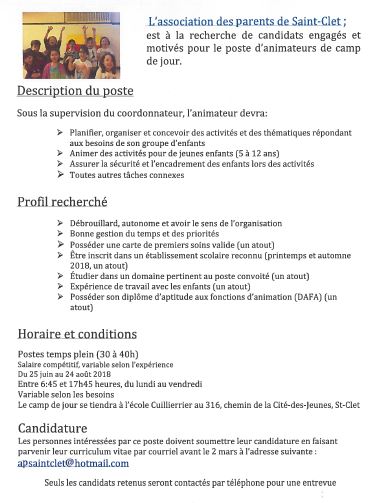 L'association des parents de Saint-Clet est à la recherche de candidats engagés et motivés pour le poste d'animateurs de camp de jour.